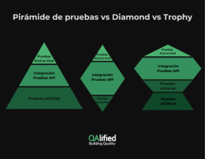 - Diamond: Equilibrio entre pruebas unitarias e integración, con pocas pruebas UI. Adaptable según arquitectura, riesgo y velocidad de entrega.